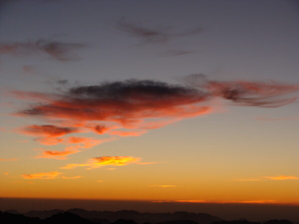 Die letzte Kraft wird mobilisiert. Die Begegnung mit Gott im Herzen tragend, steigen wir auf zum Gipfel. Noch ist es dunkel. Die steilen Felsen bezwingen wir mit letzten Kräften. Die Luft wird dünner, je höher wir steigen. Es braucht kleine Päuschen. Dann endlich haben wir es geschafft. Der Gipfel ist erreicht. Gefühlte unter null Grad, obschon es nicht so ist. Klirrende Kälte. In der mitgebrachten Decke warm eingepackt warten wir auf die Sonne. Ich höre vom Handy das Lied von Karen Drucker. „The face of god“.